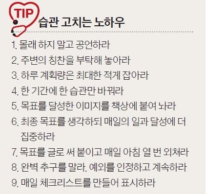운동 습관의 경우 3달 정도가 필요합니다. 우선 첫 4주는 근력운동 20분, 유산소운동 20분을 통해 중추신경과 근육 세포를 뒤흔들어 놓아야 합니다. 이후 4주 동안은 근육운동 30분, 유산소운동 20분으로 본격적으로 몸을 만들고 다음 4주는 근력운동 40분, 유산소운동 20분으로 굳히기를 해주면 됩니다. 만약 3개월간 이를 열심히 했다면 이후부터는 근력운동 30분만 해도 몸매가 유지된다고 합니다.